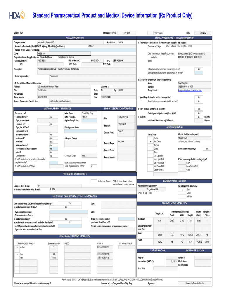 Standard Pharmaceutical Product and Medical Device Information (Rx Product Only) Version 2021Introduction Type:New ItemPRODUCT INFORMATION Company Name: AuroMedics Pharma LLC Application Number for