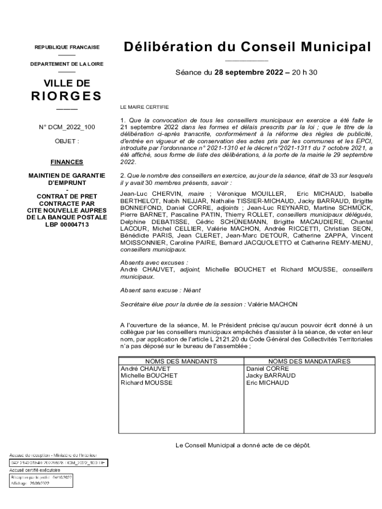 REPUBLIQUE FRANCAISE ___Dlibration du Conseil Municipal ___DEPARTEMENT DE LA LOIRE ___Sance du 28 septembre 2022 20 h 30VILLE DERIORGES ___ N DCM_2022_100 OBJET : FINANCES MAINTIEN DE GARANTIE DEMPRUNT