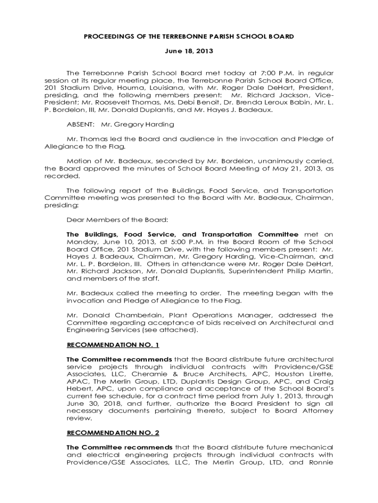 PROCEEDINGS OF THE TERREBONNE PARISH SCHOOL BOARD June 18, 2013 The Terrebonne Parish School Board met today at 7:00 P.M. in regular session at its regular meeting place, the Terrebonne Parish School