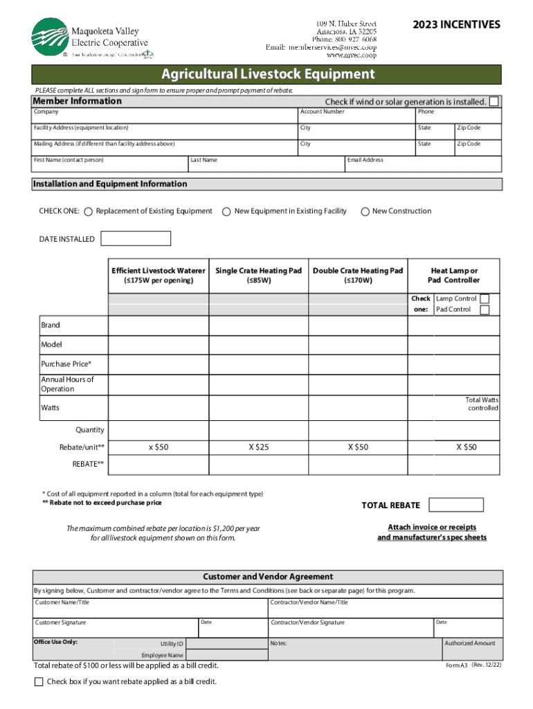 2023 INCENTIVESAgricultural Livestock Equipment PLEASE complete ALL sections and sign form to ensure proper and prompt payment of rebate.Member InformationCheck if wind or solar generation is installed.CompanyAccount