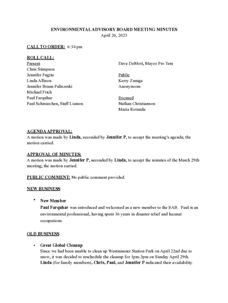ENVIRONMENTAL ADVISORY BOARD MEETING MINUTES April 26, 2023 CALL TO ORDER: 6:34 pm ROLL CALL: Present Chris Stimpson Jennifer Fugita Linda Allison Jennifer Braun Paliszeski Michael Fitch Paul Farquhar