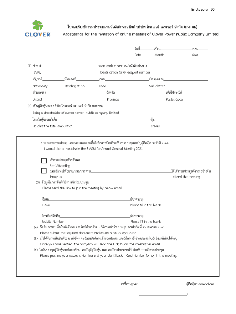 Enclosure 10 () Acceptance for the invitation of online meeting of Clover Power Public Company Limited Date Month. Year(1) / I/We, Identification.
