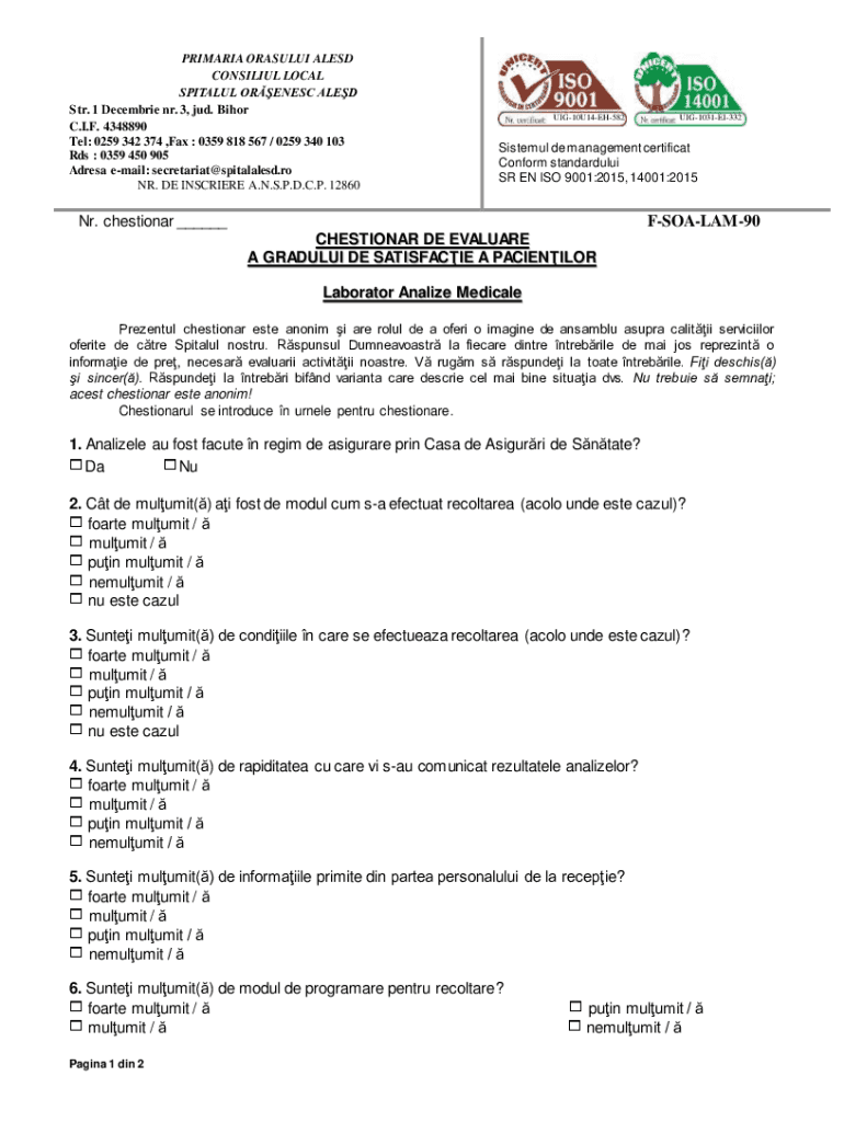 PRIMARIA ORASULUI ALESD CONSILIUL LOCAL SPITALUL ORENESC ALED S tr. 1 Decembrie nr. 3, jud. Bihor C.I.F. 4348890 Tel: 0259 342 374 ,Fax : 0359 818 567 / 0259 340 103 Rds : 0359 450 905 Adresa email: