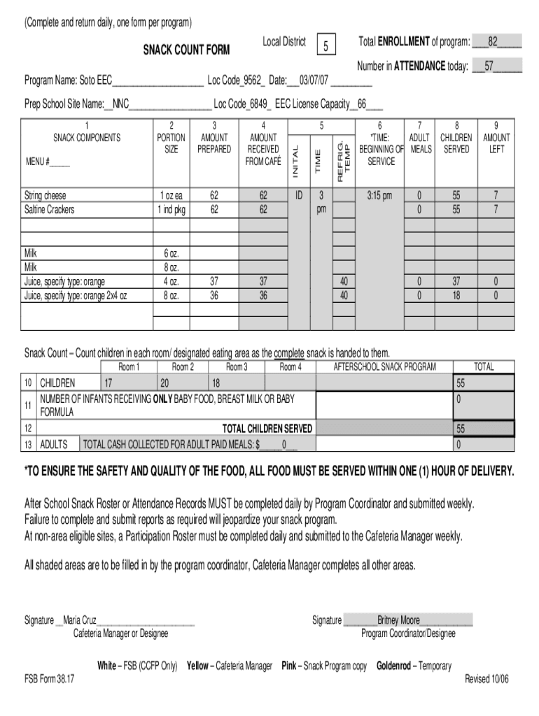 (Complete and return daily, one form per program) Local DistrictSNACK COUNT FORMTotal ENROLLMENT of program: ___82___5Number in ATTENDANCE today: ___57___ Program Name: Soto EEC___ Loc Code_9562_