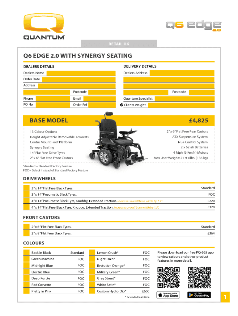 RETAIL UKQ6 EDGE 2.0 WITH SYNERGY SEATING DEALERS DETAILSDELIVERY DETAILSDealers NameDealers AddressOrder Date Address PostcodePostcodePhoneEmailQuantum SpecialistPO NoOrder RefClients Weight4,825BASE