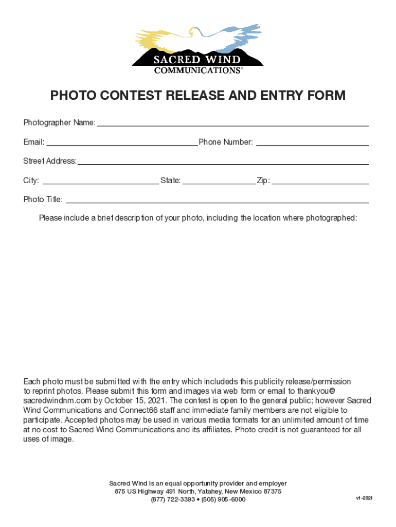 PHOTO CONTEST RELEASE AND ENTRY FORM Photographer Name: ___ Email: ___ Phone Number: ___ Street Address:___ City: ___ State: ___Zip: ___ Photo Title: ___ Please include a brief description of your