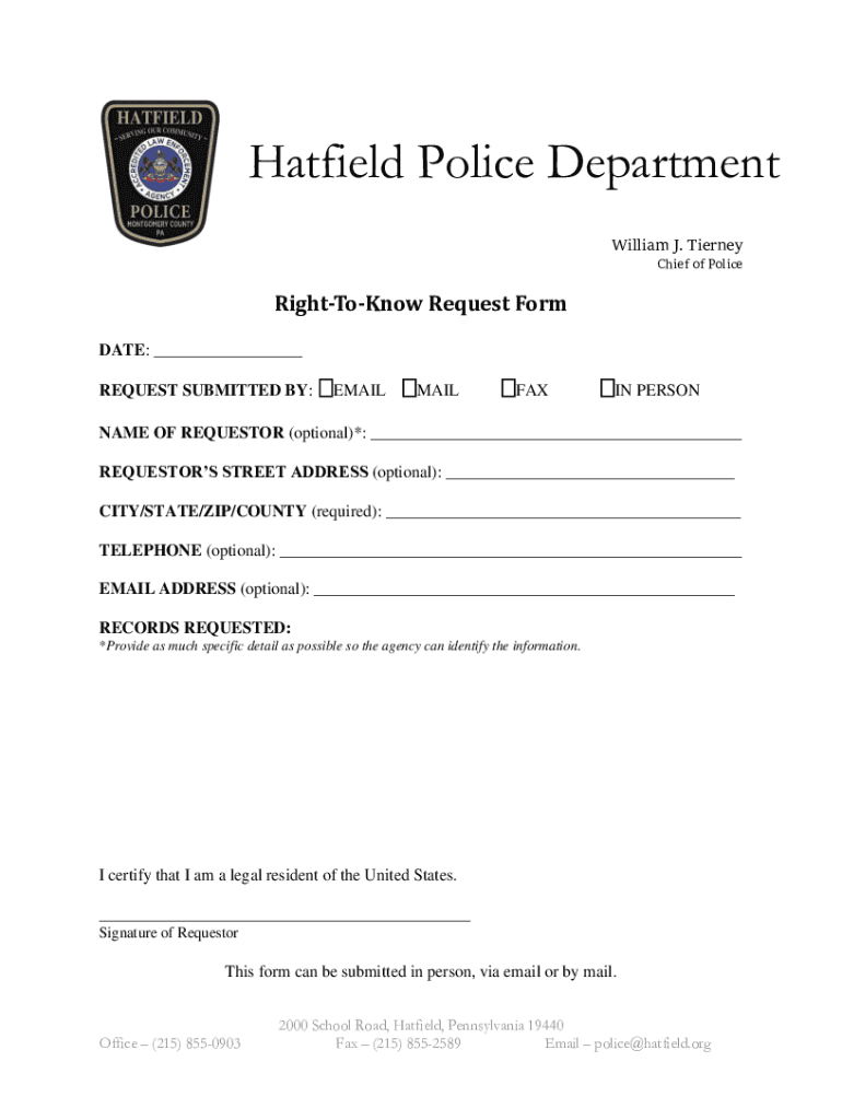 Hatfield Police Department William J. Tierney Chief of PoliceRightToKnow Request Form DATE: ___ REQUEST SUBMITTED BY: EMAIL MAILFAXIN PERSONNAME OF REQUESTOR (optional)*: ___ REQUESTORS STREET ADDRESS