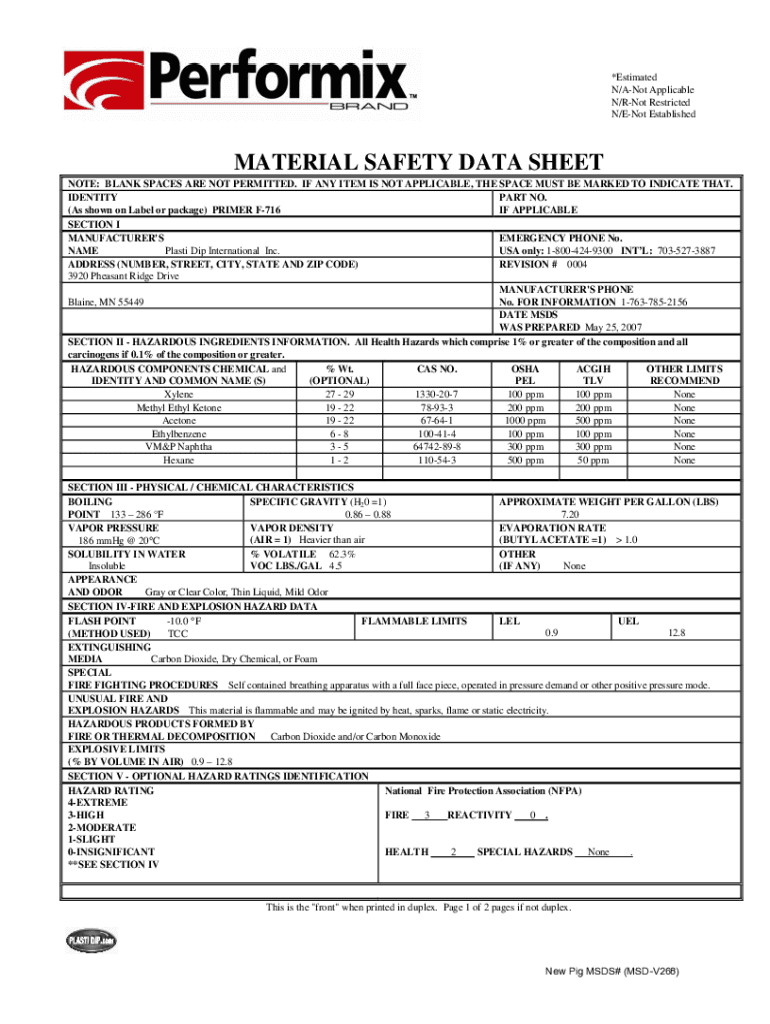 *Estimated N/ANot Applicable N/RNot Restricted N/ENot EstablishedMATERIAL SAFETY DATA SHEET NOTE: BLANK SPACES ARE NOT PERMITTED. IF ANY ITEM IS NOT APPLICABLE, THE SPACE MUST BE MARKED TO INDICATE
