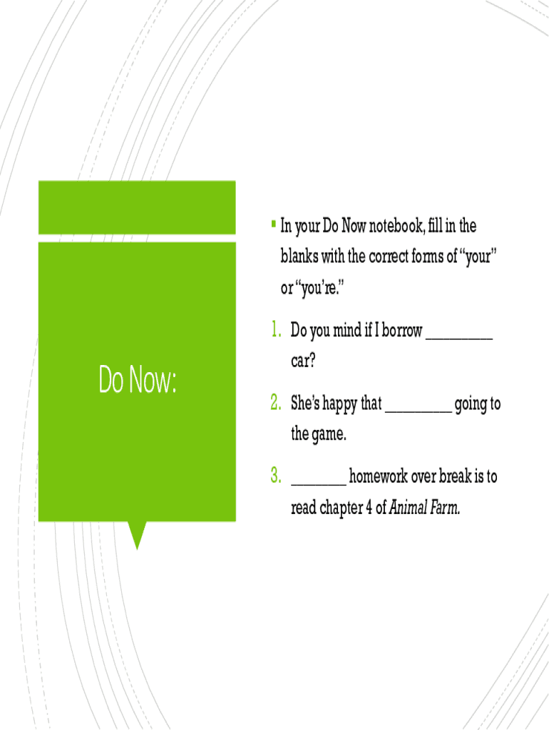 or you're.1. Do you mind if I borrow ___Do Now:car?2. She's happy that ___ going to