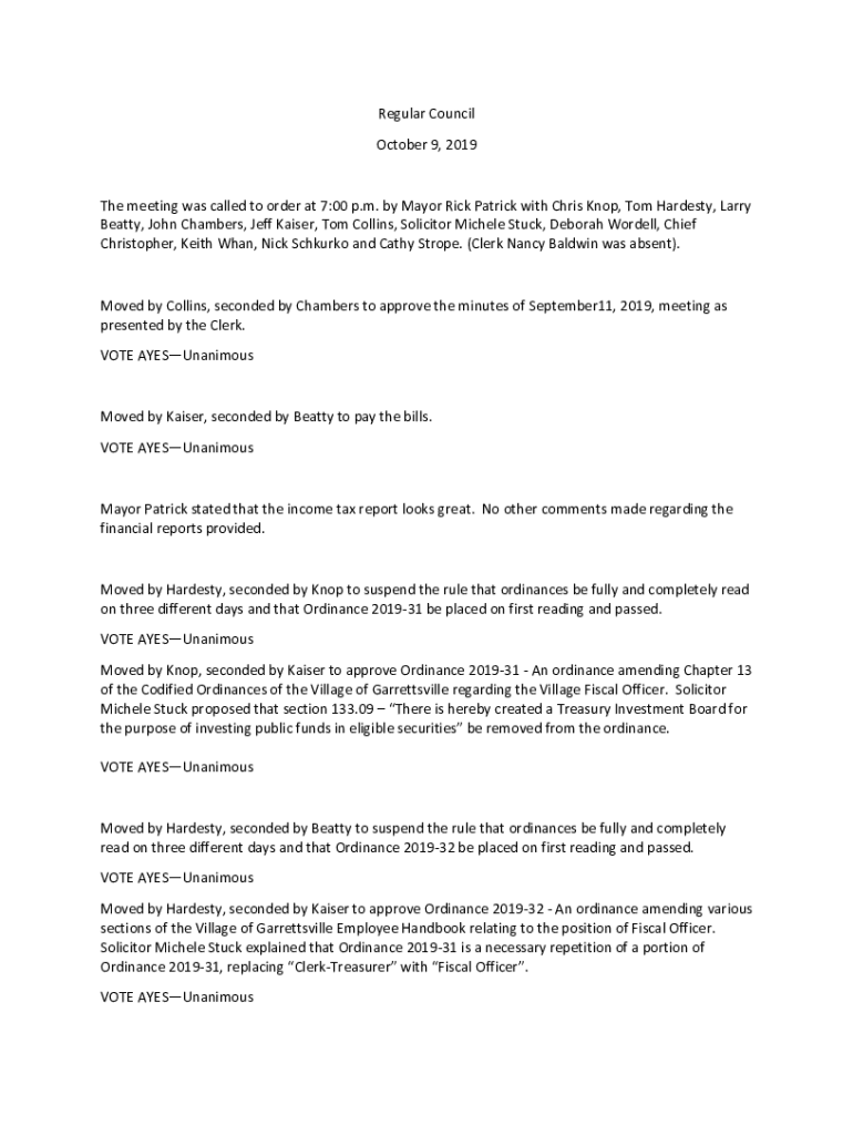 October 9, 2019The meeting was called to order at 7:00 p.m. by Mayor Rick Patrick with Chris Know, Tom Hardest, Larry