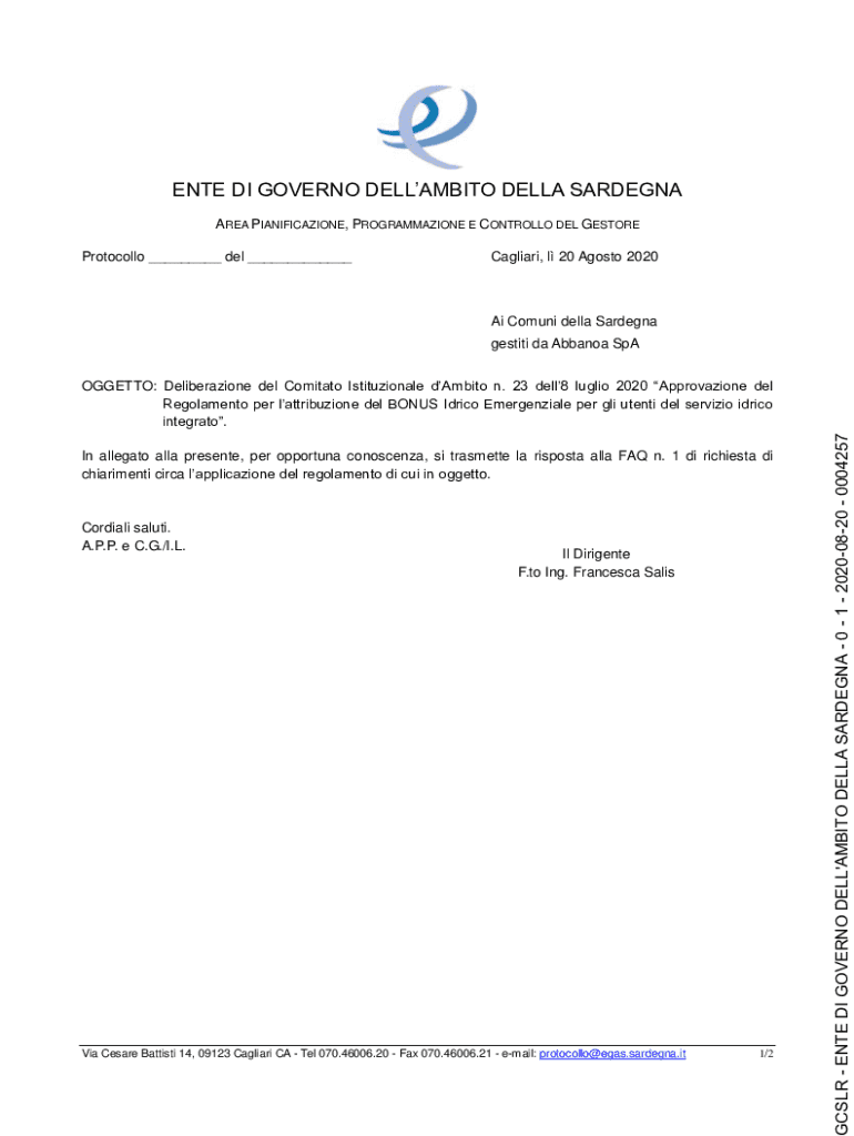 Protocol lo ___ Del ___Cagliari, l 20 Acosta 2020Ai Com uni Della Garden