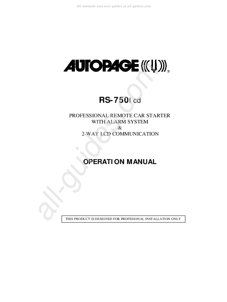 .comAll manuals and user guides at allguides.comRS750lcduidesPROFESSIONAL REMOTE CAR STARTER WITH ALARM SYSTEM & 2WAY LCD COMMUNICATIONallgOPERATION MANUALTHIS PRODUCT IS DESIGNED FOR PROFESIONAL