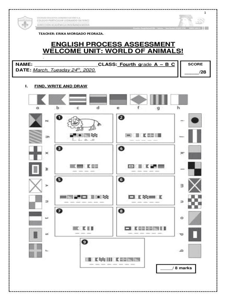 1TEACHER: ERIKA MORGADO PEDRAZA.ENGLISH PROCESS ASSESSMENT WELCOME UNIT: WORLD OF ANIMALS! NAME: ___CLASS: Fourth grade A B C DATE: March, Tuesday 24th, 2020.I.SCORE___/28FIND, WRITE AND DRAW___/