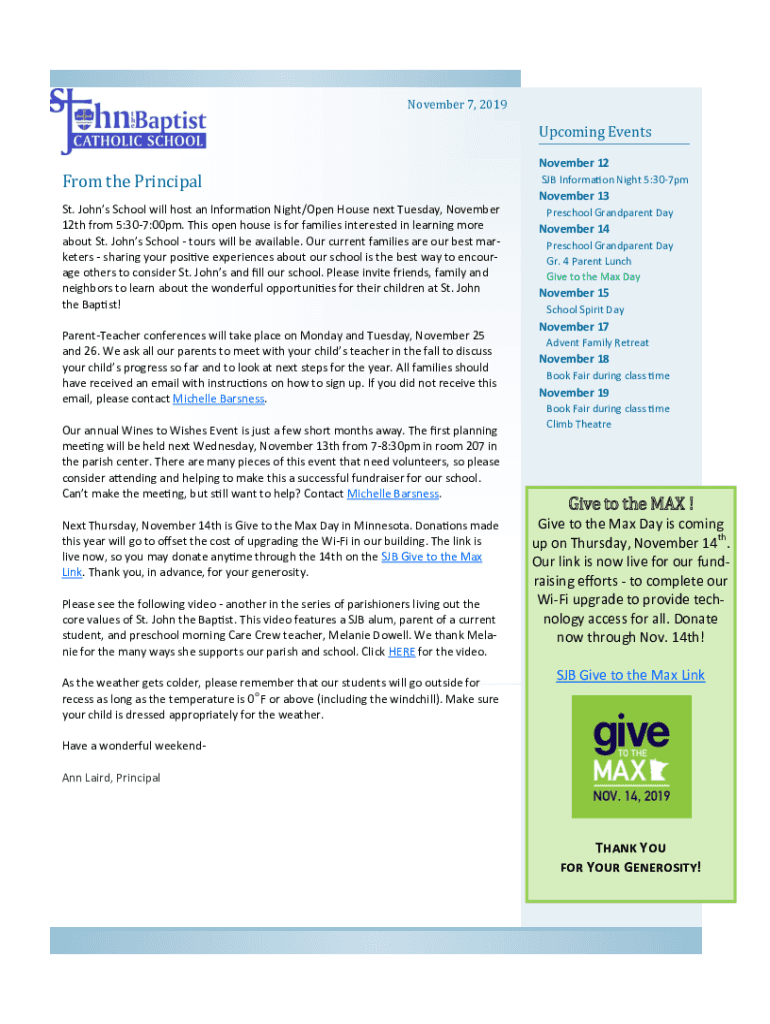November 7, 2019Upcoming EventsFrom the Principal St. Johns School will host an Information Night/Open House next Tuesday, November 12th from 5:307:00pm. This open house is for families interested