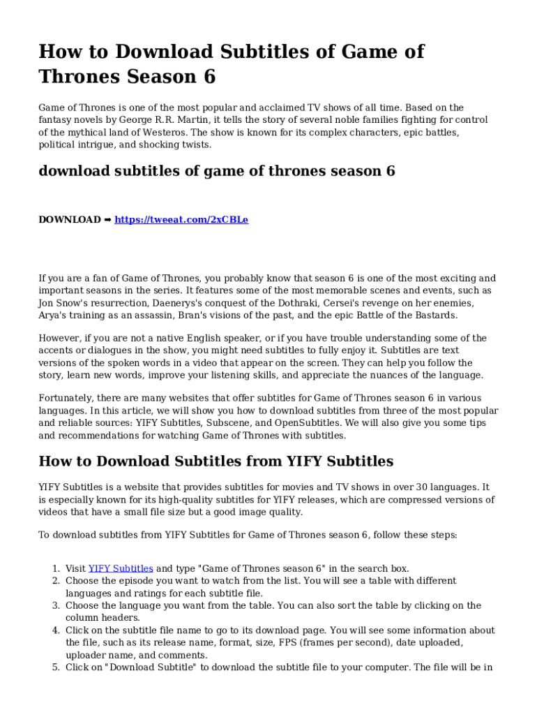 How to Download Subtitles of Game of Thrones Season 6 Game of Thrones is one of the most popular and acclaimed TV shows of all time. Based on the fantasy novels by George R.R. Martin, it tells the