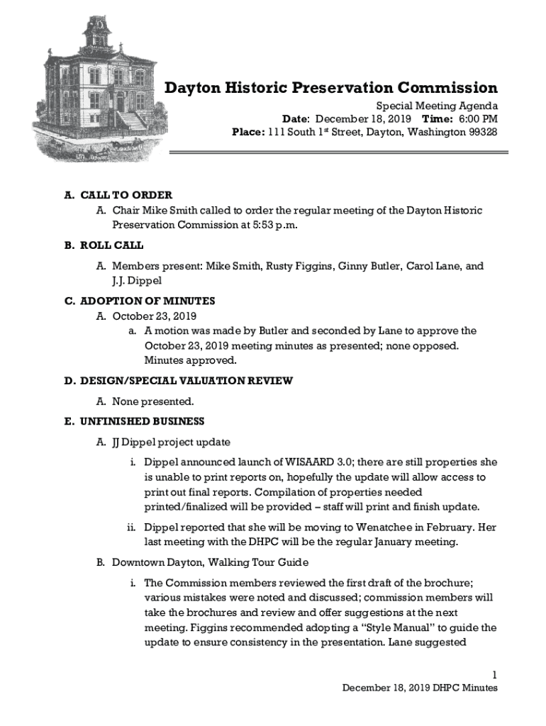 Dayton Historic Preservation Commission Special Meeting Agenda Date: December 18, 2019 Time: 6:00 PM Place: 111 South 1st Street, Dayton, Washington 99328A. CALL TO ORDER A. Chair Mike Smith called