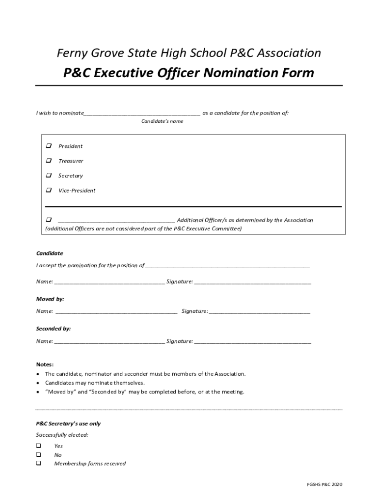 Ferny Grove State High School P&C Association Executive Officer Nomination Form