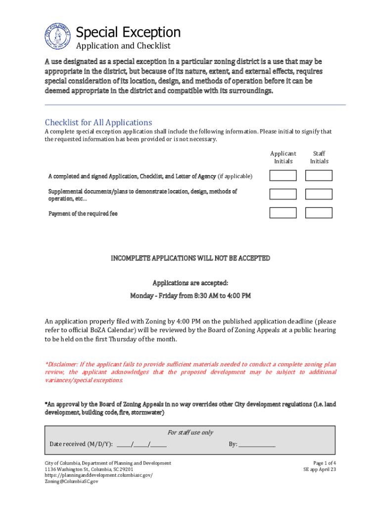 Special Exception Application and Checklist A use designated as a special exception in a particular zoning district is a use that may be appropriate in the district, but because of its nature, extent,