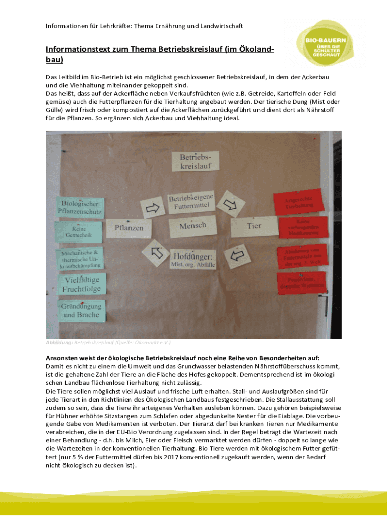 Informationen fr Lehrkrfte: Thema Ernhrung und LandwirtschaftInformationstext zum Thema Betriebskreislauf (im kolandbau) Das Leitbild im BioBetrieb ist ein mglichst geschlossener Betriebskreislauf,