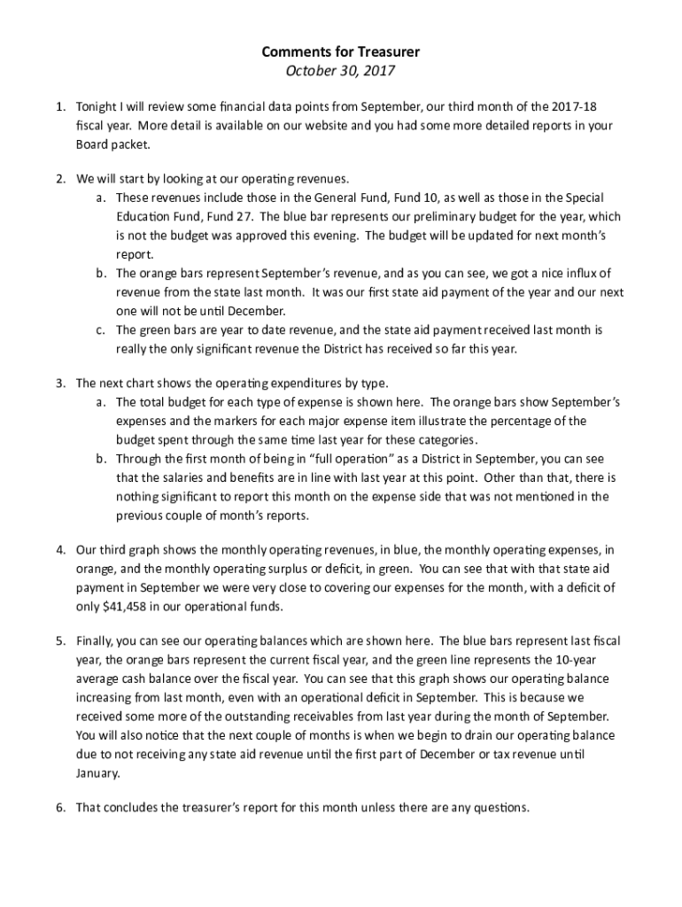 Comments for Treasurer October 30, 2017 1. Tonight I will review some nancial data points from September, our third month of the 201718 scal year. More detail is available on our website and you had