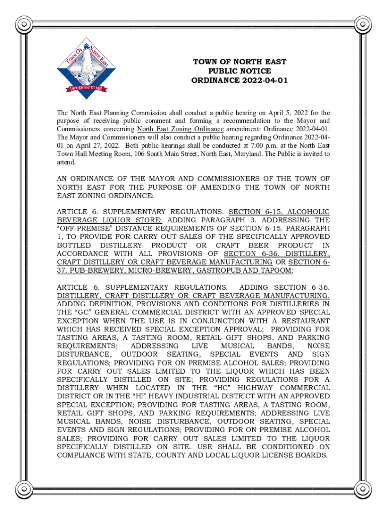 TOWN OF NORTH EAST PUBLIC NOTICE ORDINANCE 20220401The North East Planning Commission shall conduct a public hearing on April 5, 2022 for the purpose of receiving public comment and forming a recommendation