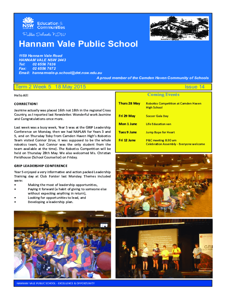 Hannam Vale Public School 1159 Hannam Vale Road HANNAM VALE NSW 2443 Tel:02 6556 7636 Fax:02 6556 7672 Email: hannamvalep.school@det.nsw.edu.au A proud member of the Camden Haven Community of SchoolsTerm