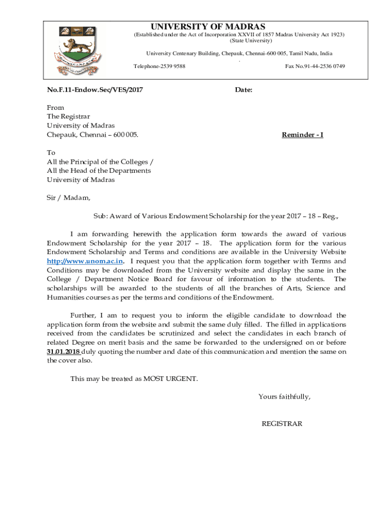 UNIVERSITY OF MADRAS (Established under the Act of Incorporation XXVII of 1857 Madras University Act 1923) (State University) University Centenary Building, Chepauk, Chennai600 005, Tamil Nadu, India