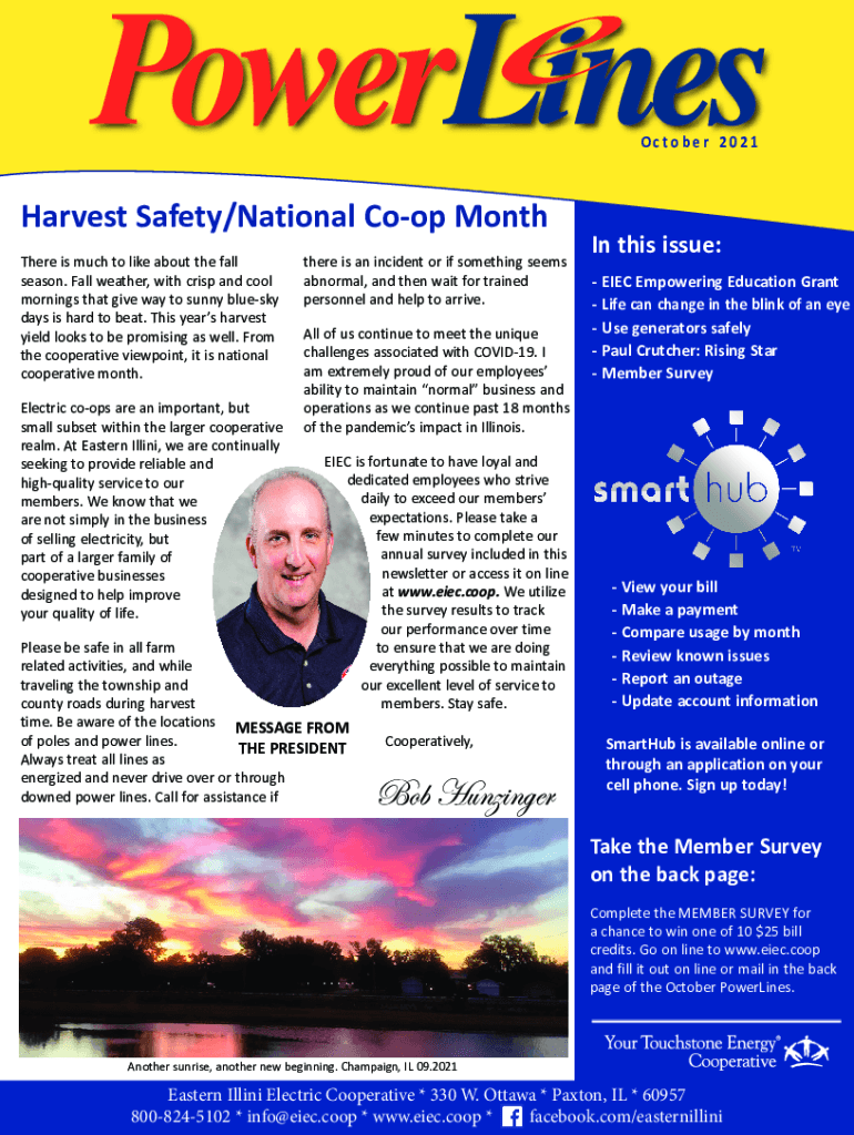 October 2021Harvest Safety/National Coop Month There is much to like about the fall season. Fall weather, with crisp and cool mornings that give way to sunny bluesky days is hard to beat. This years