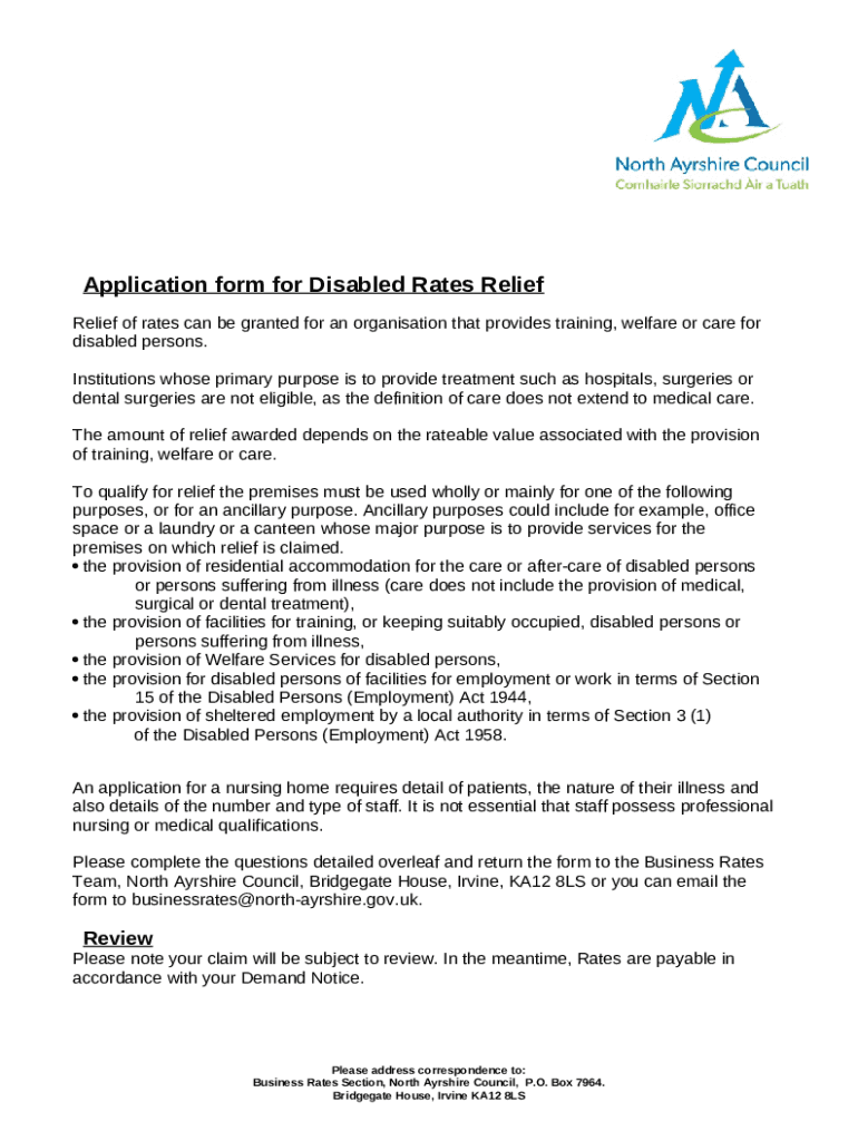 The Application for Disabled Rates Relief is a fillable form in MS Word extension required to be submitted to the specific address in order to provide specific information. It needs to be completed and signed, which can be done manually, or with the help of a certain software such as PDFfiller. It helps to fill out any PDF or Word document directly from your browser (no software requred), customize it depending on your requirements and put a legally-binding e-signature. Right after completion, user can easily send the Application for Disabled Rates Relief to the appropriate individual, or multiple individuals via email or fax. The editable template is printable too because of PDFfiller feature and options offered for printing out adjustment. Both in electronic and physical appearance, your form should have a neat and professional outlook. Also you can save it as the template for later, so you don't need to create a new file over and over. All you need to do is to amend the ready template.