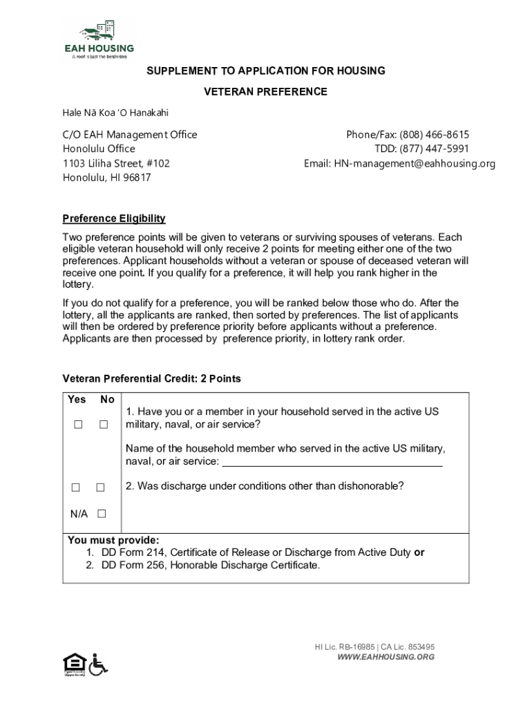 SUPPLEMENT TO APPLICATION FOR HOUSING VETERAN PREFERENCE Hale N Koa O HanakahiC/O EAH Management Office Honolulu Office 1103 Liliha Street, #102 Honolulu, HI 96817Phone/Fax: (808) 4668615 TDD: (877)