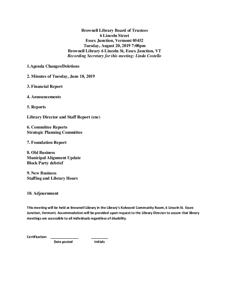 Get the free Brownell Library Board of Trustees August 2019 Agenda
