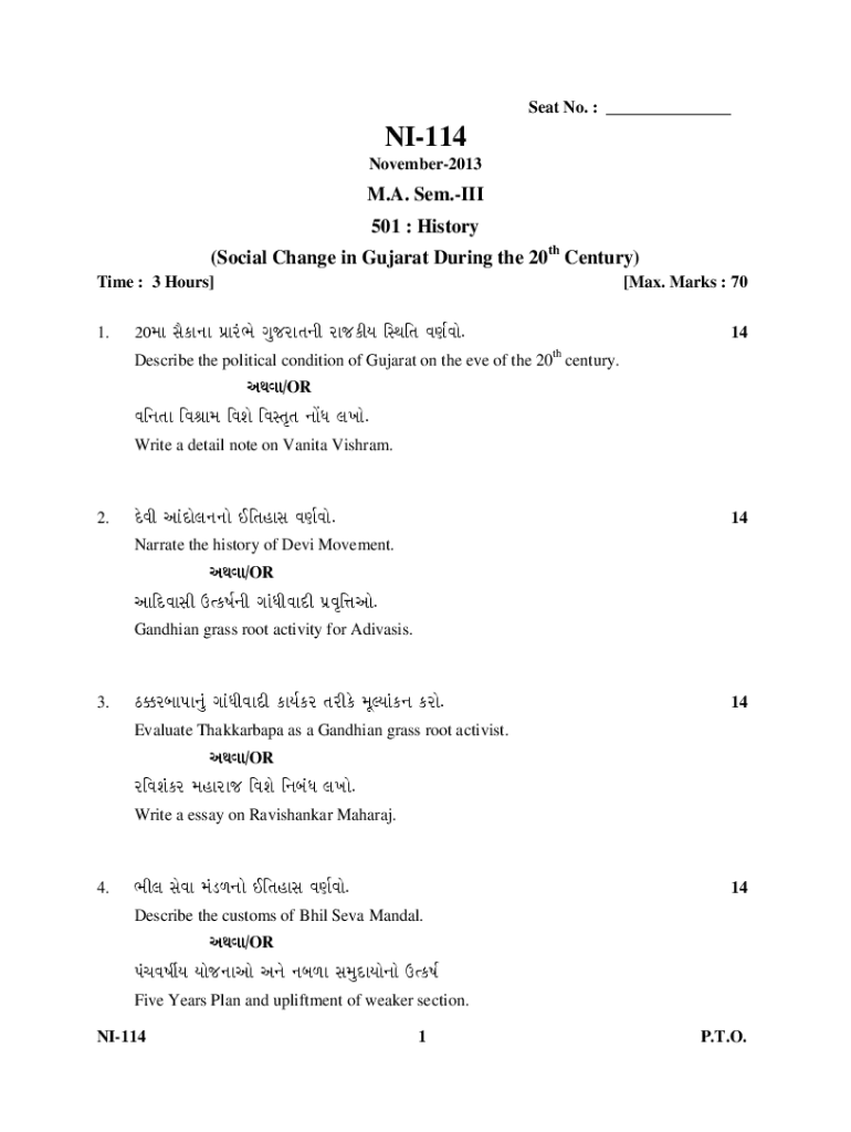 Seat No. : ___NI114 November2013M.A. Sem.III 501 : History (Social Change in Gujarat During the 20th Century) Time : 3 Hours] 1.[Max. Marks : 7020 .14 thDescribe the political condition of Gujarat