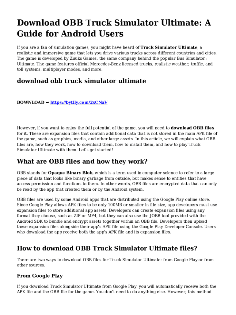 Download OBB Truck Simulator Ultimate: A Guide for Android Users If you are a fan of simulation games, you might have heard of Truck Simulator Ultimate, a realistic and immersive game that lets you