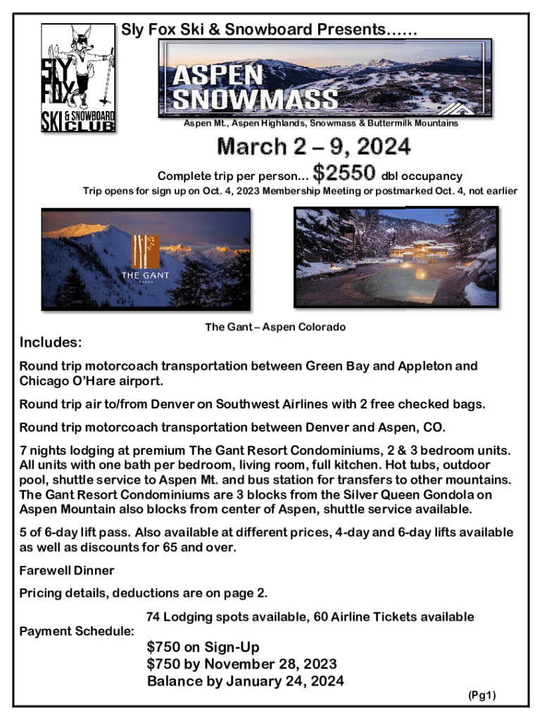 Sly Fox Ski & Snowboard PresentsAspen Mt., Aspen Highla Highlands, nds, Snowmass & Buttermilk MountainsMarch 2 9, 2024 Complete trip per person...$2550 dbl occupancyTrip opens for sign up on Oct.
