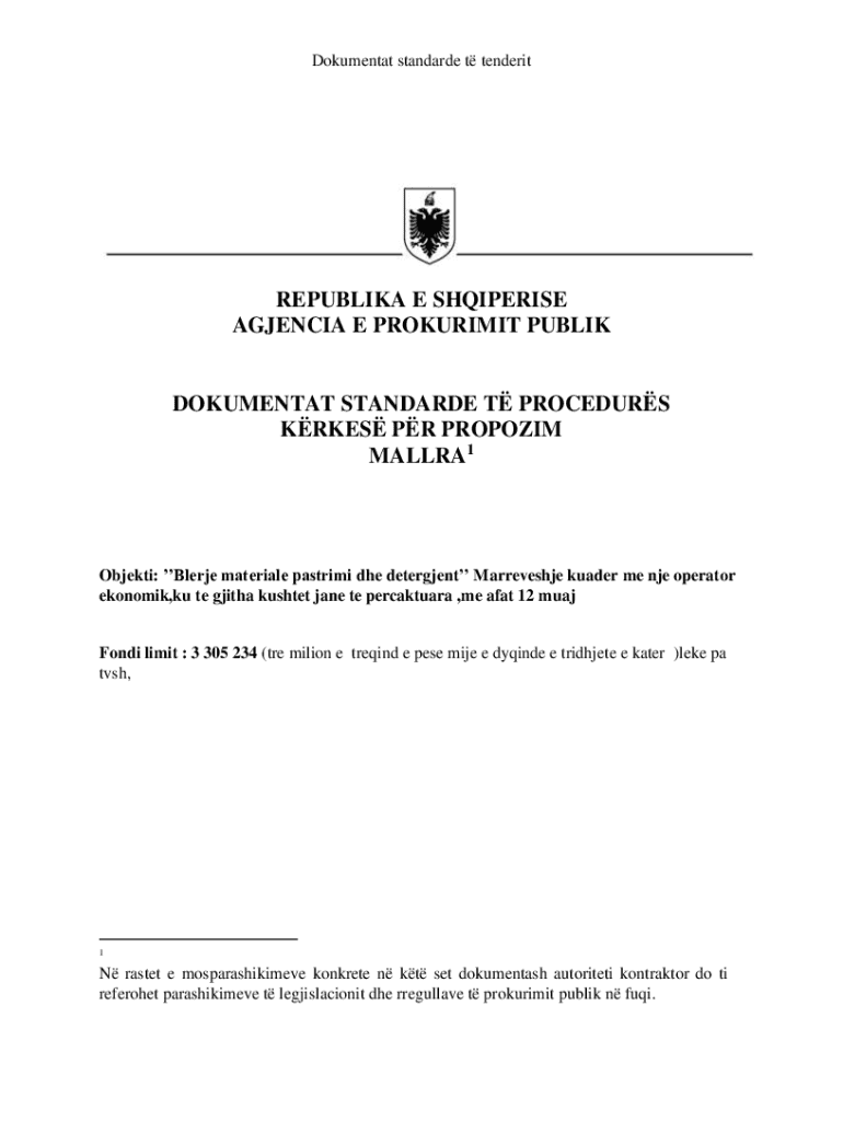 Dokumentat standarde t tenderitREPUBLIKA E SHQIPERISE AGJENCIA E PROKURIMIT PUBLIKDOKUMENTAT STANDARDE T PROCEDURS KRKES PR PROPOZIM MALLRA1Objekti: Blerje materiale pastrimi dhe detergjent Marreveshje