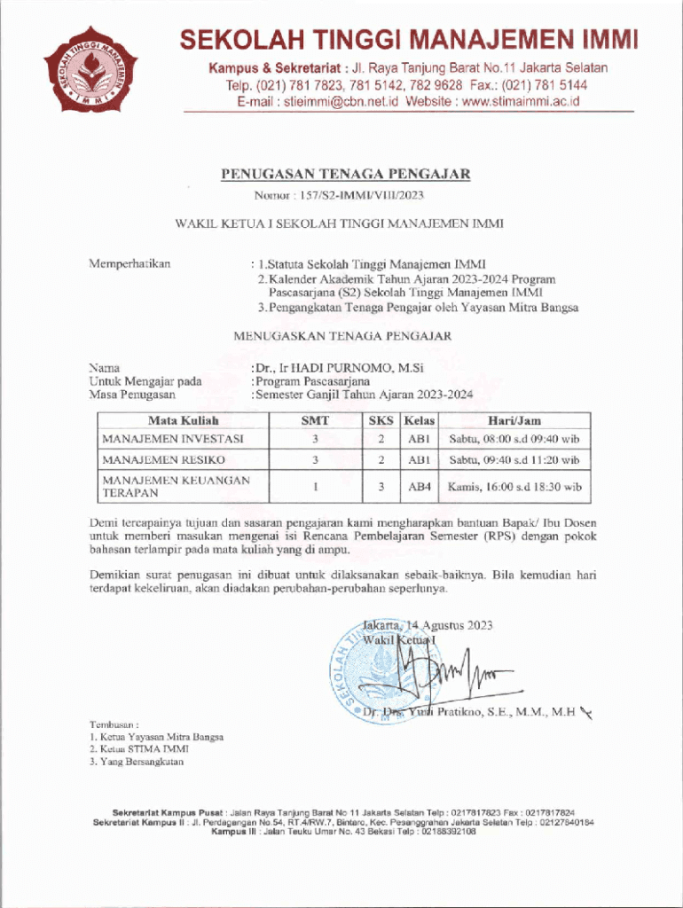 UNIVERSITAS MITRA BANGSA JAKARTA REKAP PEMBELAJARAN DARING SEMESTER GANJIL 20232024 Mata Kuliah:MANAJEMEN INVESTASIKelas / Smt:AB1 / IIIKode MK / SKS:MK 0732 / 2Prodi:Magister ManajemenNama Dosen:Dr.,