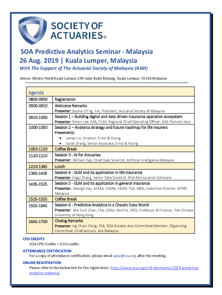 SOA Predictive Analytics Seminar Malaysia 26 Aug. 2019 | Kuala Lumper, Malaysia With The Support of The Actuarial Society of Malaysia (ASM) Venue: Westin Hotel Kuala Lumpur,199 Jalan Bukit Bintang,