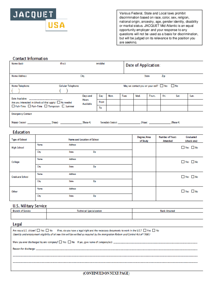 Various Federal, State and Local laws prohibit discrimination based on race, color, sex, religion, national origin, ancestry, age, gender identity, disability or marital status. JACQUET Mid Atlantic