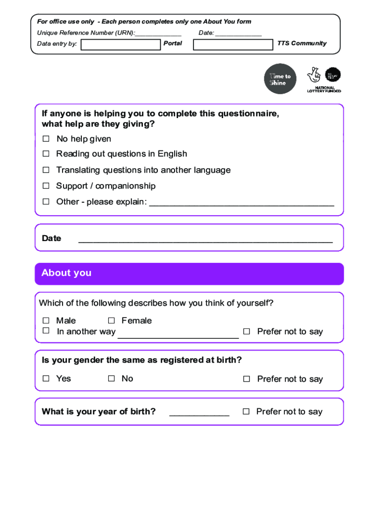 For office use only Each person completes only one About You formential care homeUnique Reference Number (URN):___Date: ___ Ageing Better questionnaire ___ Portal Data entry by: Ageing Better questionnaire