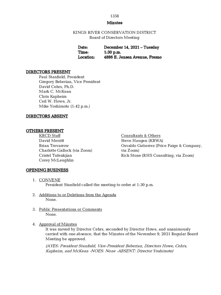 1358 Minutes KINGS RIVER CONSERVATION DISTRICT Board of Directors Meeting Date: Time: Location:December 14, 2021 Tuesday 1:30 p.m. 4886 E. Jensen Avenue, FresnoDIRECTORS PRESENT Paul Stanfield, President