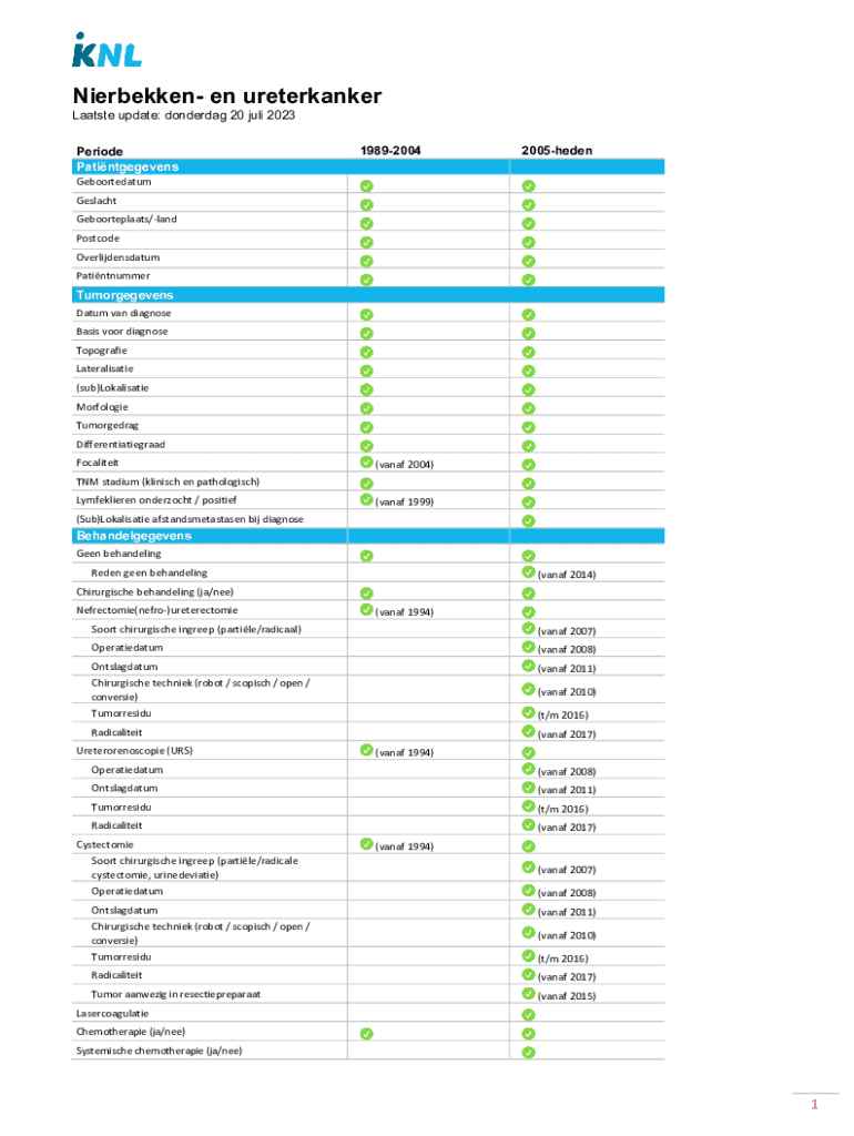 Nierbekken en ureterkanker Laatste update: donderdag 20 juli 2023 Periode Patintgegevens198920042005hedenGeboortedatum GeslachtGeboorteplaats/land Postcode Overlijdensdatum PatintnummerTumorgegevens