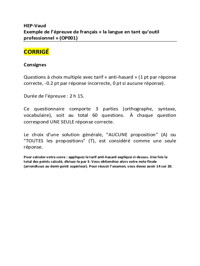 HEPVaud Exemple de lpreuve de franais la langue en tant quoutil professionnel (OP001)CORRIG Consignes Questions choix multiple avec tarif antihasard (1 pt par rponse correcte, 0.2 pt par rponse incorrecte,