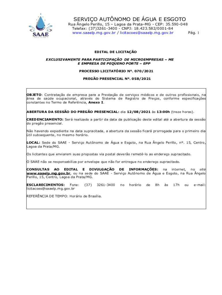 www.saaelp.mg.gov.br / licitacoes@saaelp.mg.gov.br