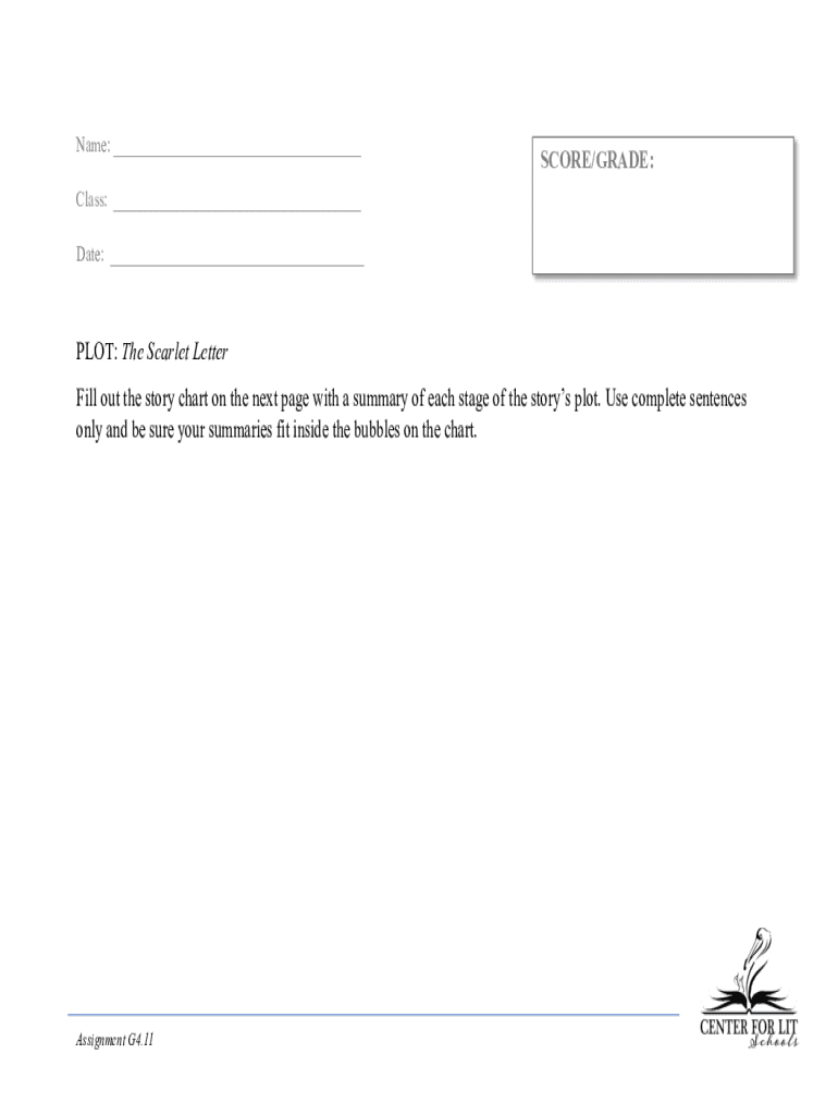 Name: ___SCORE/GRADE:Class: ___ Date: ___PLOT: The Scarlet Letter Fill out the story chart on the next page with a summary of each stage of the storys plot. Use complete sentences only and be sure