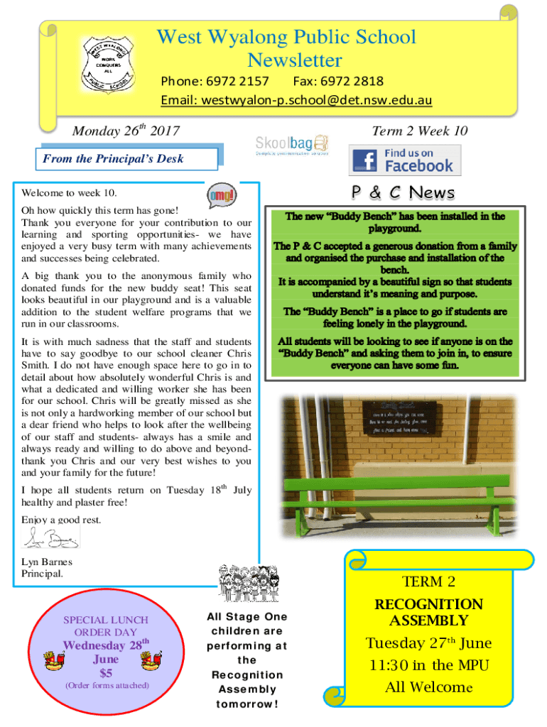 West Wyalong Public School Newsletter``Phone: 6972 2157 Fax: 6972 2818 Email: westwyalonp.school@det.nsw.edu.au Monday 26th 2017Term 2 Week 10From the Principals Desk Welcome to week 10. Oh how quickly