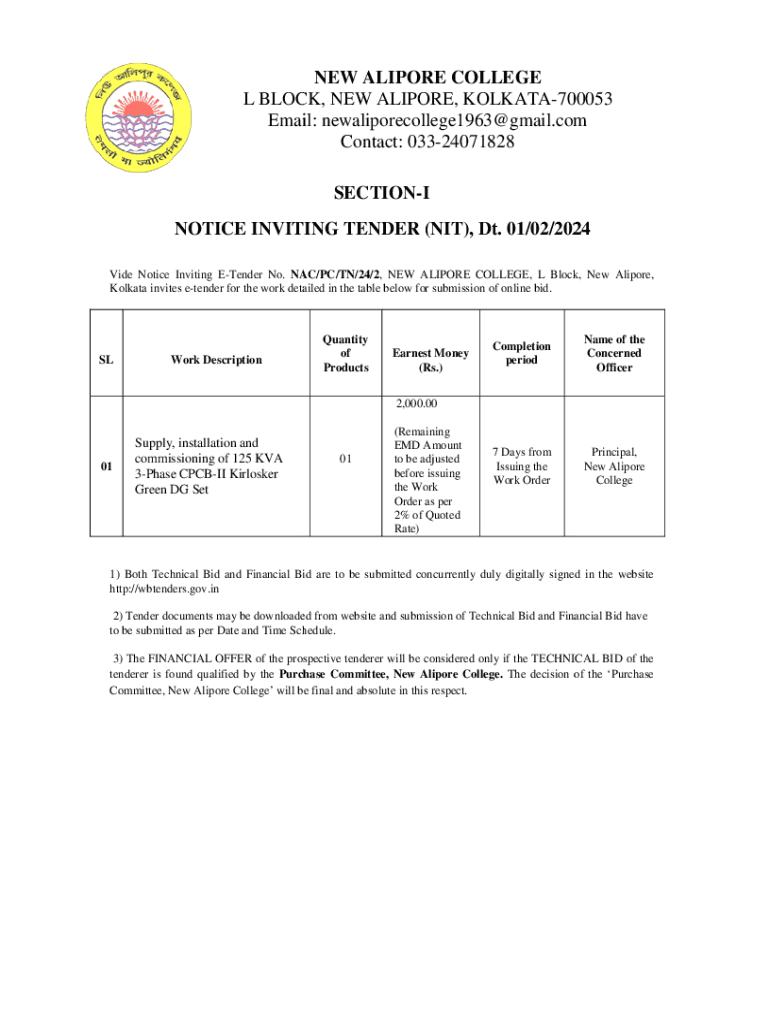 NEW ALIPORE COLLEGE L BLOCK, NEW ALIPORE, KOLKATA700053 KOLKATA 700053 Email: newaliporecollege1963@gmail.com Contact: 03324071828 SECTIONI NOTICE INVITING TENDER (NIT), Dt. 01/02/202 /2024 Vide Notice