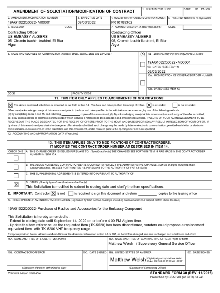 2. AMENDMENT/MODIFICATION NUMBER3. EFFECTIVE DATE4. REQUISITION/PURCHASE REQUISITION NUMBER19AG1022Q0022 M0000109/08/2022PR107893026. ISSUED BYCODE7. ADMINISTERED BY (If other than Item 6)Contracting