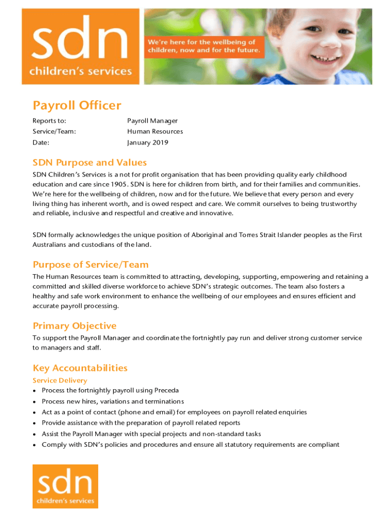 Payroll Officer Reports to:Payroll ManagerService/Team:Human ResourcesDate:January 2019SDN Purpose and Values SDN Childrens Services is a not for profit organisation that has been providing quality
