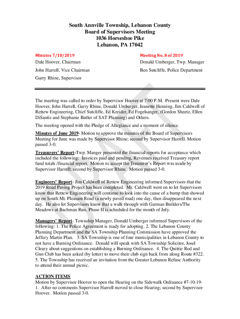South Annville Township, Lebanon County Board of Supervisors Meeting 1036 Horseshoe Pike Lebanon, PA 17042 Minutes 7/10/2019Meeting No. 8 of 2019Dale Hoover, ChairmanDonald Umberger, Twp. ManagerJohn