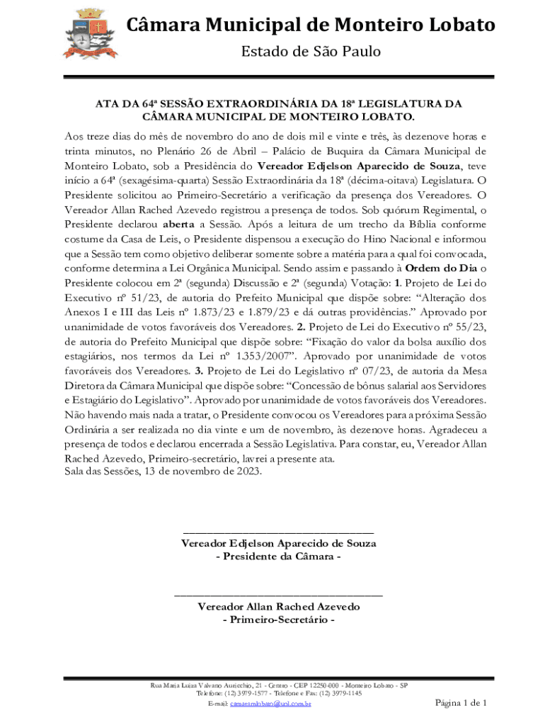 Cmara Municipal de Monteiro Lobato Estado de So Paulo ATA DA 64 SESSO EXTRAORDINRIA DA 18 LEGISLATURA DA CMARA MUNICIPAL DE MONTEIRO LOBATO. Aos treze dias do ms de novembro do ano de dois mil e vinte